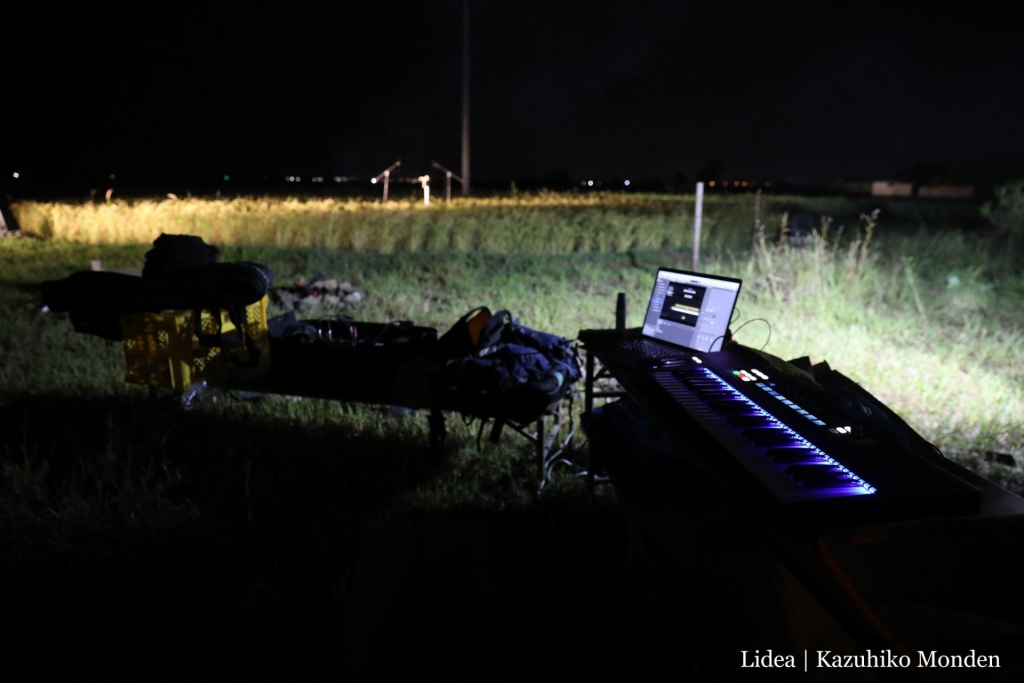 10/05に荒浜のめぐみキッチンで開催する「賢治と焚き火と丸い田んぼ」の現場リハーサルが始まりました。簡易的にマイク・スピーカー・PA機材を準備し、キーボードでの演奏もテスト。焚き火を囲みながら、文字通り「稲穂が揺れる田んぼ」をステージにします。