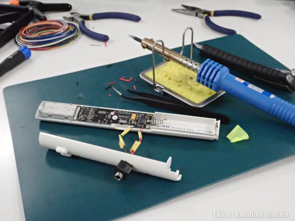 とても久し振りのハンダゴテ作業。こちらは市販のガイガーカウンターの音声を外部出力できるようにする改造。元々は本体のミニ・スピーカーで「ピッ」と鳴るものですが、これをスピーカーに接続して大音量でも鳴らせるようにする改造です。