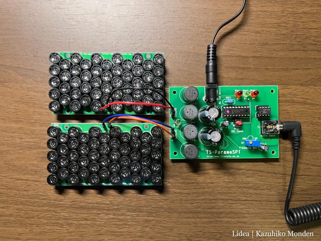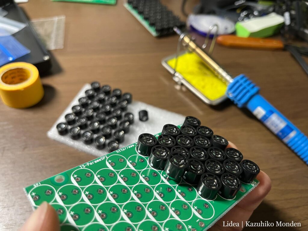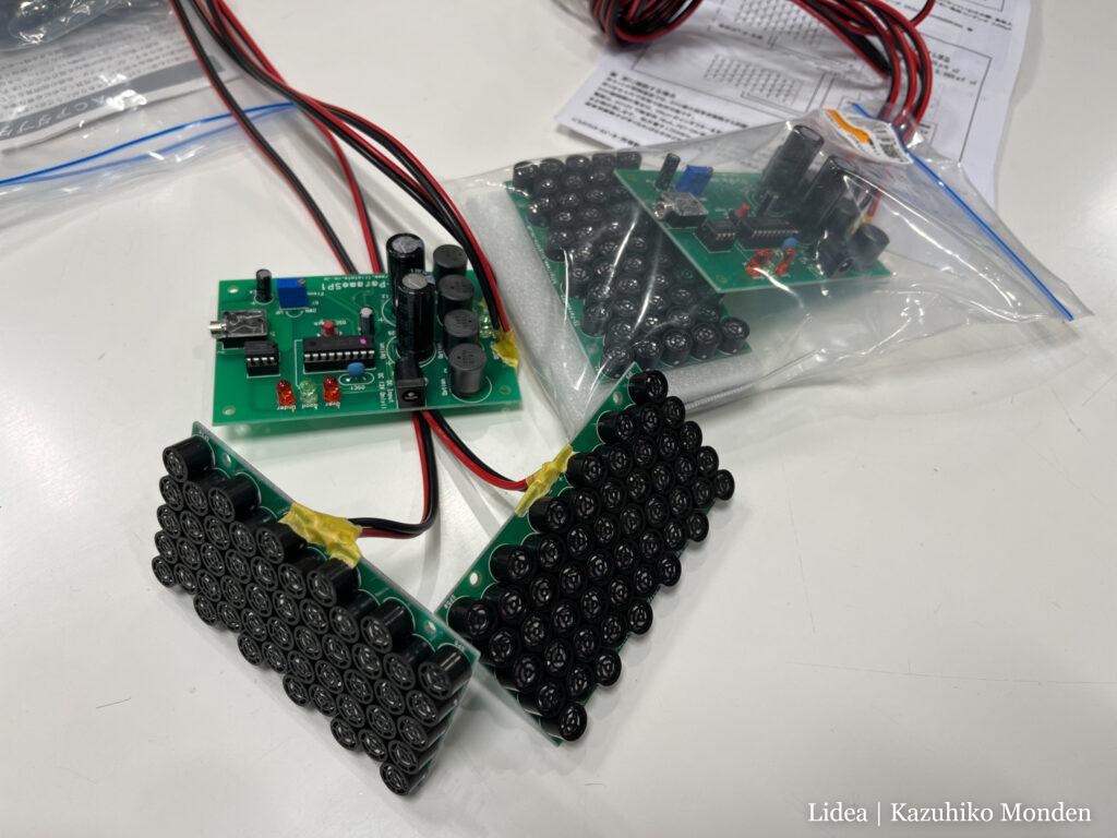 そしてもうひとつ作ったのが超指向性スピーカー。こちらは工作キットになっているものですが、なんせスピーカーが基盤一枚あたり50個もついてるので、ハンダ付けの箇所数がすごいことになってました。最終的に4枚+駆動回路を組み立てたので、ハンダをあれよあれよと消費していって、足りなくなるか?!と焦りました。
