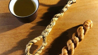 しめ縄作りの取材に行って、余った藁で輪っか付きの藁紐作った。隣は中華街のお菓子。 / vi ...